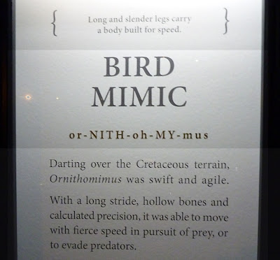 One striking exhibit was a large, dimly lit room with dinosaurs illuminated by spotlights, and related artifacts in niches along two walls. As Joan and I walked through a Bach Brandenberg Concerto was playing, and these ornithomimus specimens were poised on the floor.