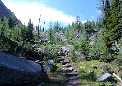 Not long after guiding you up and up through the boulder field, the Yukness Ledges trail levels out; soon after, the trail to Sleeping Poet's Pool leaves to the right. Don't look for it on any map, unless you have an old Lake O'Hara map; it's no longer official nor publicized, and it is steep. Here a photo looking back at this trail, taken on another day. The Yukness Ledges trail is near the bottom, while the Sleeping Poet trail hauls almost straight up. Careful foot placement is required and poles are very handy.